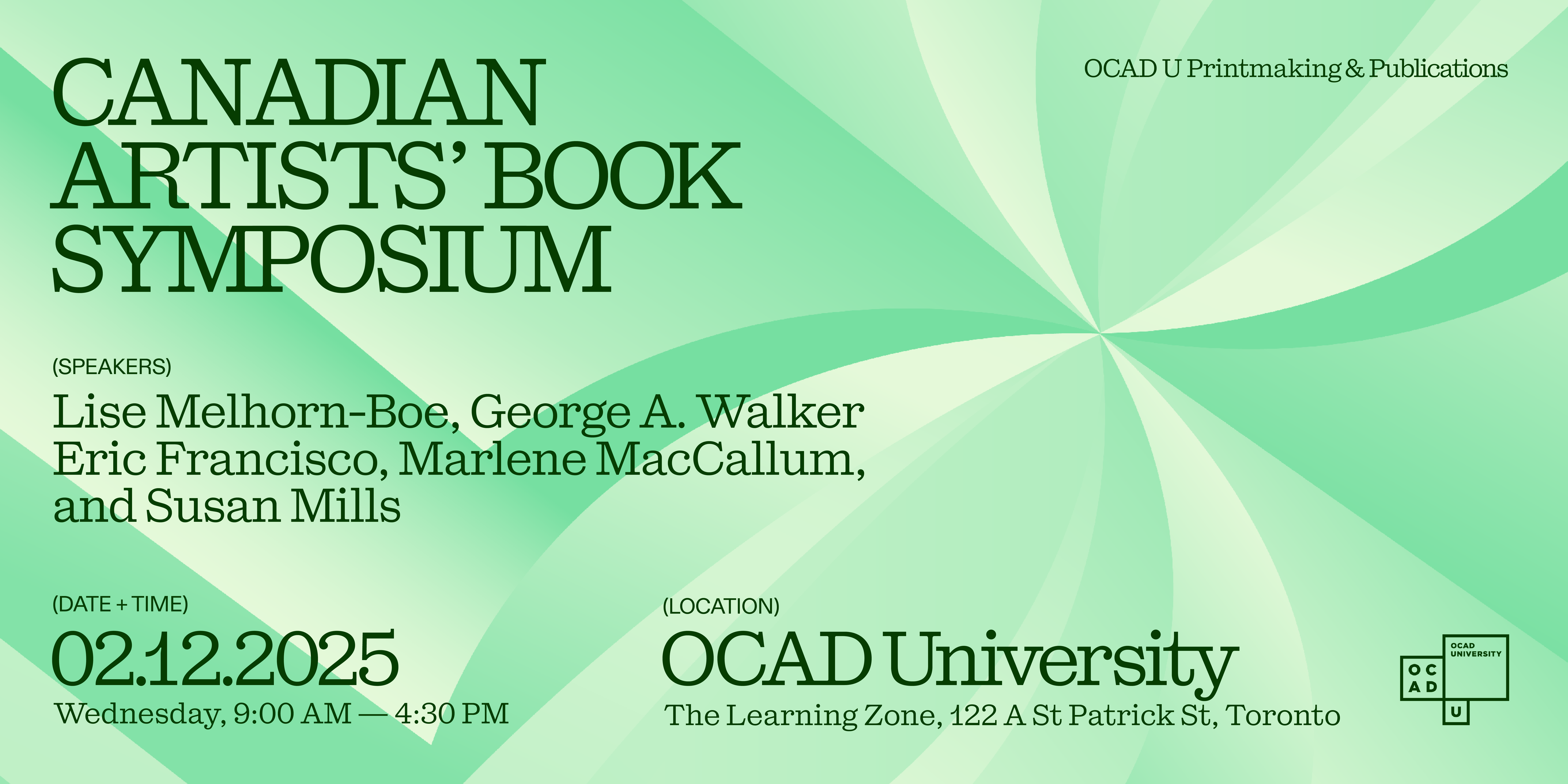 The Canadian Artists' Book Symposium celebrates the creative practices of artists who explore the medium of artists' books. Taking place at OCAD University Library's Learning Zone (122 A St. Patrick St., Toronto) on Wednesday, February 12, 2025, the symposium will feature invited artists: Eric Francisco, George Walker, Lise Melhorn-Boe, Marlene MacCallum, and Susan Mills. These artists will share insights into their artistic processes—from initial concepts to production techniques.